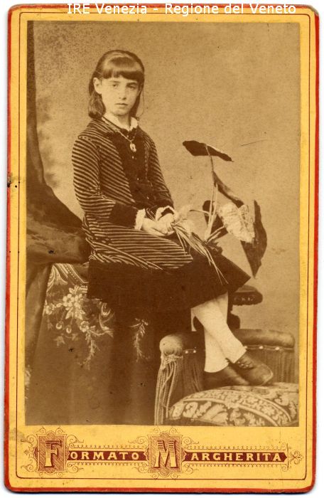 Ritratto: in studio, figura intera, frontale - Bambina: seduta, piedi appoggiati su una poltroncina - Acconciatura: capelli sciolti sulle spalle, frangia - Vestiario: abito scuro a righe, calze bianche - Gioielli: collana con cammeo