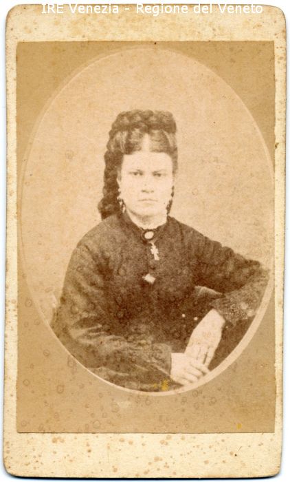 Ritratto: in studio, mezzo busto, frontale - Donna - Acconciatura: elaborata - Vestiario: abito scuro - Gioielli: orecchini, collana con croce - Sfondo