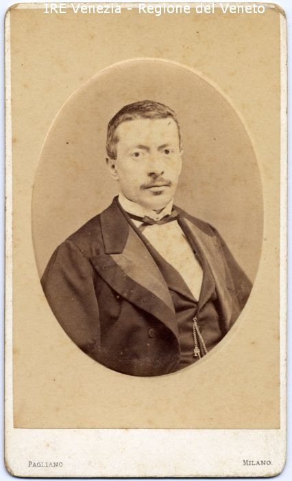 Ritratto: in studio, mezzo busto, frontale - Uomo: con baffi - Vestiario: giacca scura con bavero chiaro, camicia bianca, gilét, cravattino - Sfondo