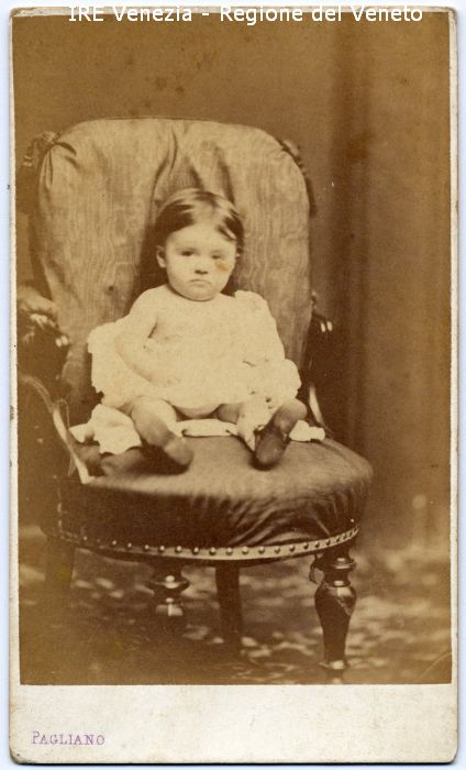Ritratto: in studio, figura intera, frontale - Bambina: seduta su una poltroncina - Vestiario: abito bianco - Arredamento: poltroncina imbottita