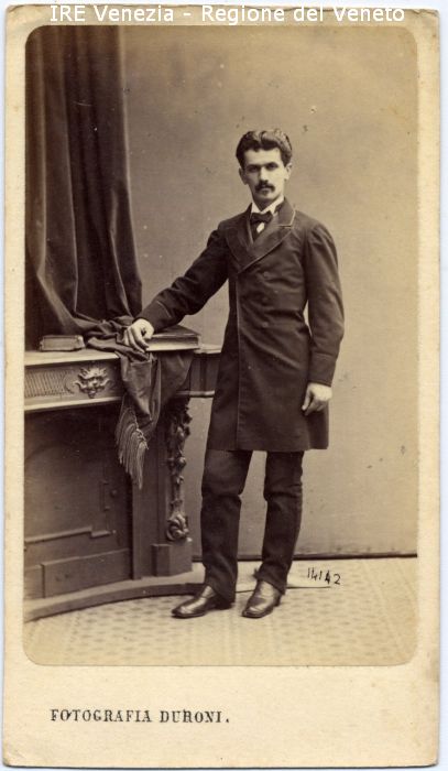 Ritratto: in studio, figura intera, frontale - Uomo: con baffi, in piedi, con la mano appoggiata su un libro posto su un mobile - Vestiario: giacca doppiopetto lunga scura, camicia bianca, papillon