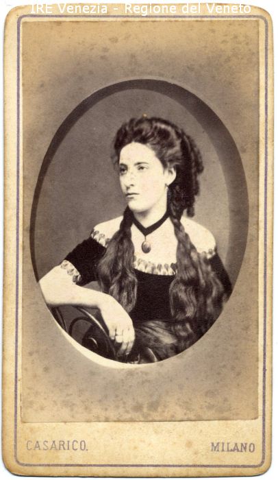 Ritratto: in studio, mezzo busto, in semi profilo - Donna: appoggiata allo schienale di una sedia - Acconciatura: boccoli, trecce - Vestiario: abito scuro, maniche corte, spalle scoperte - Gioielli: collarino con ciondolo, anello - Arredamento: sedia