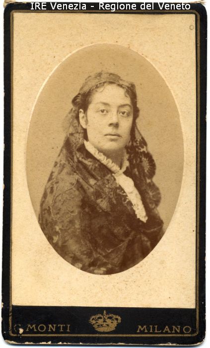 Ritratto: in studio, mezzo busto, frontale - Donna - Vestiario: abito scuro, colletto bianco, velo in pizzo nero in testa - Sfondo