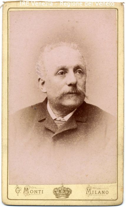 Ritratto: in studio, mezzo busto, in semi profilo - Uomo: con baffi - Vestiario: giacca scura, camicia bianca, cravatta (?) a righe - Sfondo