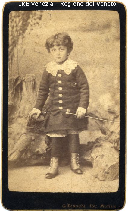 Ritratto: in studio, figura intera, frontale - Bambina: in piedi, con una mano appoggiata ad una roccia, un bastoncino nella mano sinistra - Vestiario: abito scuro, bottoni, colletto in pizzo bianco, stivaletti