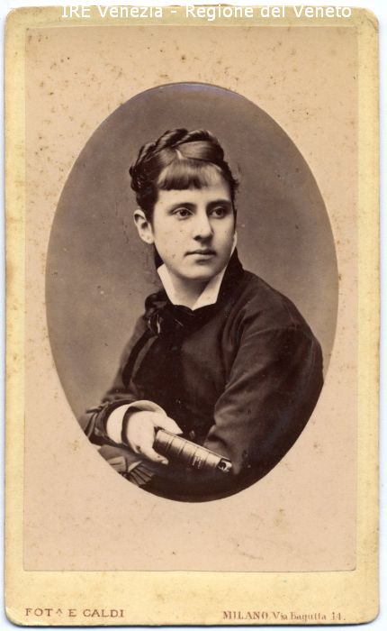 Ritratto: in studio, mezzo busto, frontale - Donna: giovane, con un libro in mano - Acconciatura: elaborata, capelli raccolti, frangia - Vestiario: abito scuro, colletto bianco, foulard - Oggetti: libro con copertina rigida - Sfondo