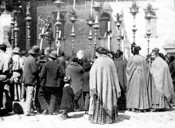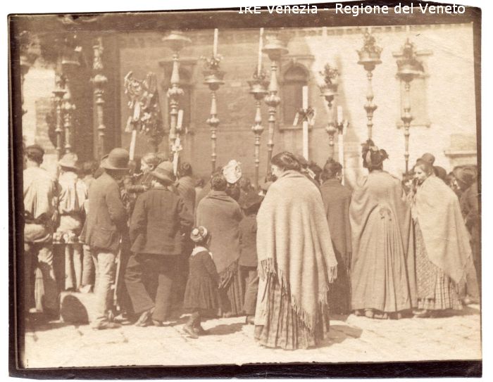 Venezia - Vita veneziana e lagunare - Manifestazioni religiose - Processione del Corpus Domini - Luogo non identificato - Folla - Segnali processionali - Aste portacero