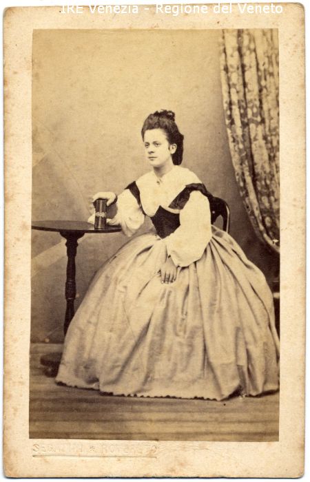 Ritratto: in studio, figura intera, in semi profilo - Donna: giovane, seduta, mano su un libro (?) appoggiato sul tavolino - Vestiario: abito chiaro, nastri scuri sulle maniche - Arredamento: sedia, tavolino tondo in legno, libro (?), tenda - Sfondo