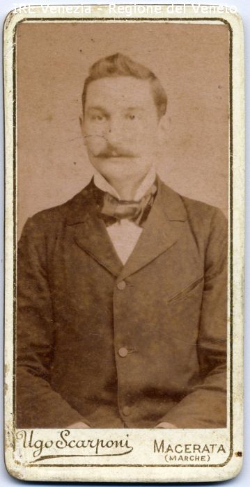 Ritratto: in studio, mezzo busto, frontale - Uomo: con baffi - Vestiario: giacca, bottoni, camicia bianca, papillon - Sfondo