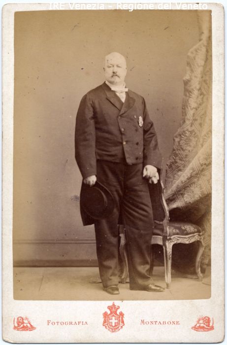 Ritratto: in studio, figura intera, frontale - Uomo: con baffi, in piedi, appoggiato allo schienale di una sedia, cappello in mano, fazzoletto in mano - Vestiario: giacca doppiopetto, camicia bianca - Arredamento: sedia intarsiata, tenda