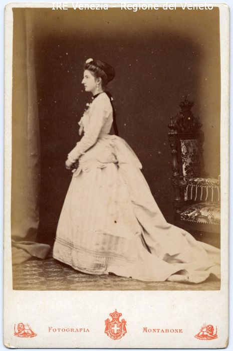 Ritratto di Margherita di Savoia - Ritratto: in studio, figura intera, in profilo - Donna: in piedi, mani unite - Acconciatura: capelli raccolti, fascia, fiore - Vestiario: abito chiaro, strascico