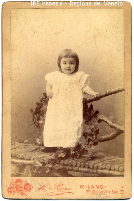 Ritratto: in studio, figura intera, frontale - Bambina: in piedi sopra una panchina - Acconciatura: capelli a caschetto, frangia - Vestiario: abito bianco - Arredamento: panchina, legno, edera - Sfondo