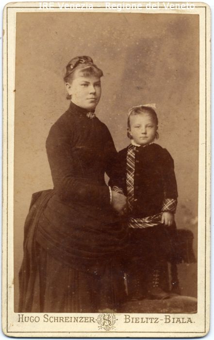 Ritratti: in studio - Donna: in piedi, tiene per mano la bambina - Vestiario: abito scuro - Gioielli: spilla, orecchini - Bambina: in piedi sopra una sedia - Vestiario: abito scuro, inserti a quadri scozzesi, stivaletti - Arredamento: sedia - Sfondo