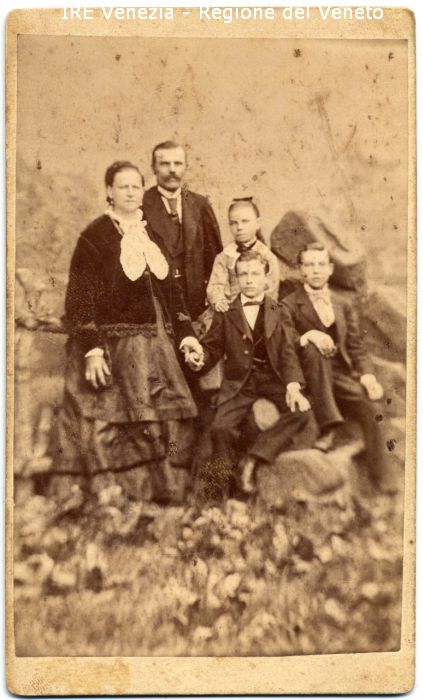 Ritratti di gruppo: in studio, figure intere, frontali - Famiglia: padre, madre, tre figli - Donna: in piedi, tiene per mano un figlio - Vestiario: ampia gonna, giacca scura, colletto bianco in pizzo - Uomo: con baffi, in piedi