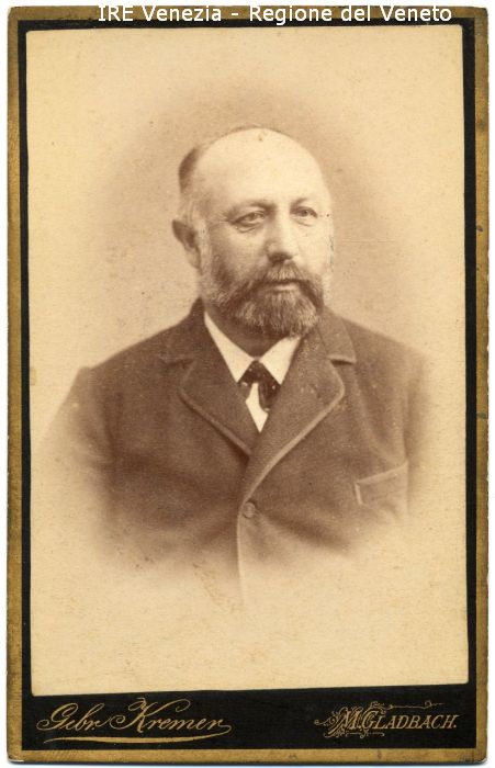 Ritratto: in studio, mezzo busto, in semi profilo - Uomo: con baffi e barba brizzolata - Vestiario: giacca, camicia bianca, cravattino - Sfondo