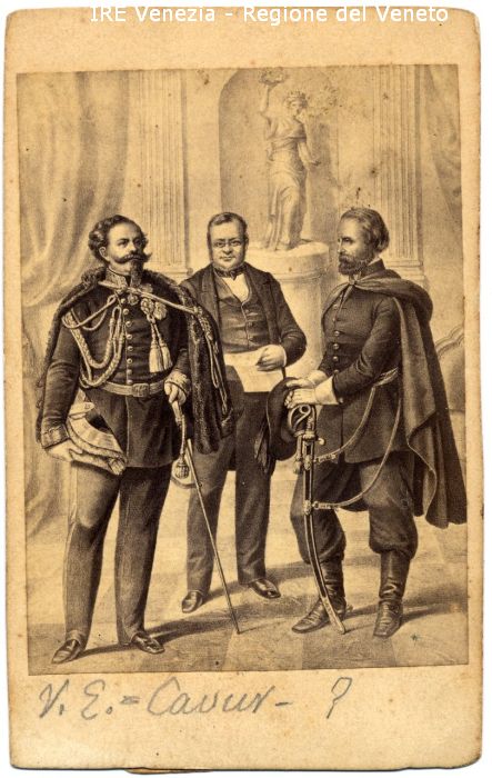 Ritratti: da disegno, figure intere, in piedi - Vittorio Emanuele: con baffi e pizzetto, cappello in mano, sciabola, mantello - Cavour: con occhiali, foglio in mano - garibaldi: di profilo, barba e baffi, sciabola, mantello