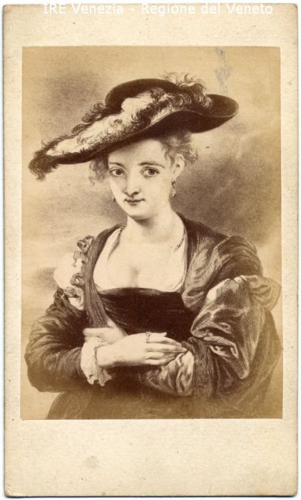 Ritratto: da un quadro, mezzo busto, frontale - Donna - Vestiario: maniche a sbuffo, cappello con piume - Gioielli: orecchini pendenti, anello - Sfondo