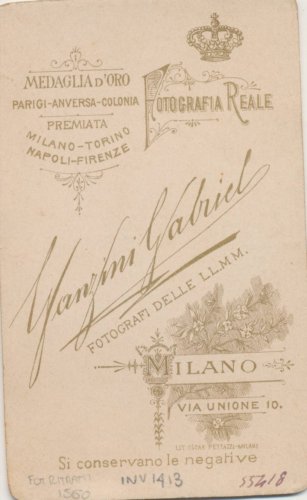 - STEMMI sul supporto secondario, verso - commerciale - Marchio - Litografia di Oscar Pettazzi con al centro la denominazione e l'indirizzo dello studio fotografico; in alto a sinistra l'attestazione di una medaglia d'oro con la scritta a destra "Fotografia Reale".