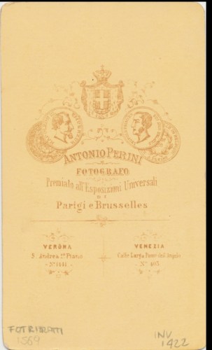 - STEMMI sul supporto secondario: verso: al centro - dell'autore - Marchio - Marchio dell'autore con la scritta "Antonio Perini/ Fotografo/ Premiato all'esposizioni universali/ di/ Parigi e Brusselles" e le riproduzioni delle medaglie ottenute presso le menzionate Esposizioni Universali. Vi sono inoltre riportati gli indirizzi dei due stabilimenti del fotografo: "Antonio Perini Fotografo. Verona, S. Andrea 1° Piano, n. 1441" e "Antonio Perini Fotografo. Venezia, Calle Larga Ponte dell'Angelo, n. 403".