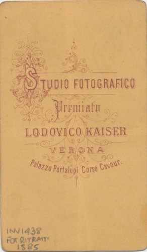- STEMMI sul supporto secondario: verso: al centro - dell'autore - Marchio - Marchio tipografico dell'autore in cui, entro un'elegante decorazione, si trova la scritta: "Studio fotografico/ premiato/ Lodovico Kaiser/ Verona/ Palazzo Portalupi Corso Cavour".