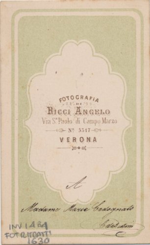 - STEMMI sul supporto secondario: verso: al centro - dell'autore - Marchio - Marchio dell'autore con la scritta "Fotografia/ Ricci Angelo/ Via S. Paolo di Campo Marzio/ n. 5317/ Verona".