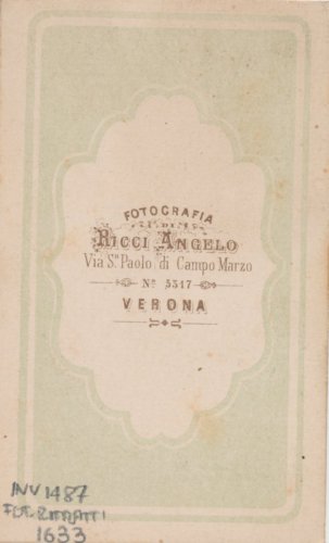 - STEMMI sul supporto secondario: verso: al centro - dell'autore - Marchio - Marchio dell'autore con la scritta "Fotografia/ Ricci Angelo/ Via S. Paolo di Campo Marzio/ n. 5317/ Verona".