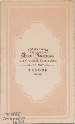 - STEMMI sul supporto secondario: verso: al centro - dell'autore - Marchio - Marchio dell'autore con la scritta "Fotografia/ Ricci Angelo/ Via S. Paolo di Campo Marzio/ n. 5317/ Verona".