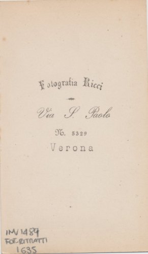 - STEMMI sul supporto secondario: verso: al centro - dell'autore - Marchio - Marchio con la scritta: "Fotografia Ricci/ Via s. paolo/ N. 5329/ Verona".