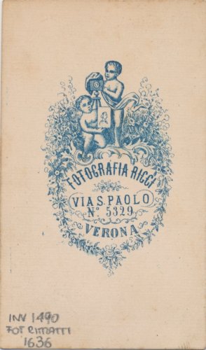 - STEMMI sul supporto secondario: verso: al centro - dell'autore - Marchio - Marchio ad inchiostro blu con la scritta "Fotografia Ricci/ Via S. Paolo/ n. 5329/ Verona" entro una cornice sormontata da due putti con una macchina fotografica ed un ritratto fra le mani.