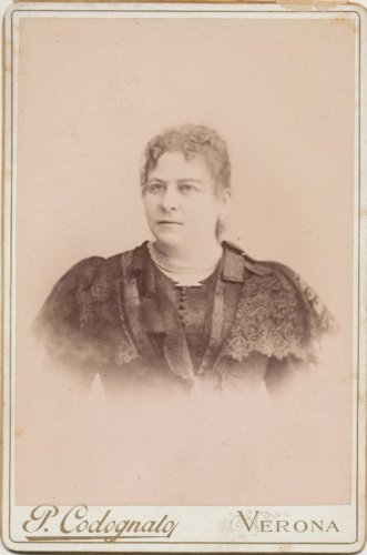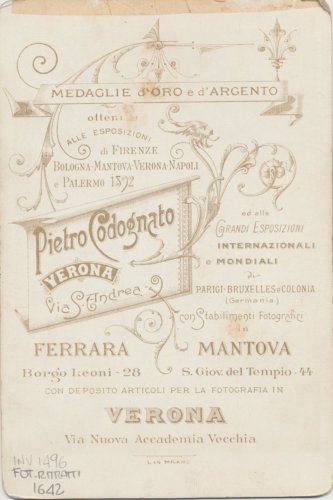 - STEMMI Sul supporto secondario: verso - dell'autore - Marchio - Marchio dell'autore, entro una cornice illusionistica e raffinate decorazioni, con la scritta "Pietro Codognato/ Verona/ Via S. Andrea"; attorno ad esso sono riportate le scritte: " Medaglie d'oro e d'argento/ Otten[ute]/ alle esposizioni/ di Firenze/ Bologna- Mantova- Verona- Napoli/ e Palermo 1892/ ed alle grandi esposizioni/ internazionali/ e mondiali/ di/ Parigi- Bruxelles e Colonia/ (Germania)/ con Stabilimenti Fotografici/in/ Ferrara/ Borgo Leoni- 28/ Mantova/ S. Giov. del Tempio - 44/ con deposito articoli per la fotografia in/ Verona/ Via Nuova Accademia Vecchia".