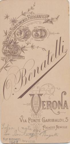 - STEMMI Sul supporto secondario: verso - Marchio - Marchio dell'autore con la scritta "Premiato stabilimento Fotografico/ O. Benatelli/ Verona/ Via Ponte Garibaldi, 5/ Palazzo Newille" e la riproduzione delle medaglie ottenute a Parigi, Firenze e Vicenza.
