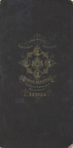 - STEMMI Sul supporto secondario: verso - dell'autore - Marchio - Marchio dell'autore con la scritta "Premiato stabilimento Fotografico/ O. Benatelli/ Verona/ Via Ponte Garibaldi, 5/ Palazzo Newille" e la riproduzione di alcuni tondi con i ritratti di Daguerre, Niepce, Talbot e B.Forta.