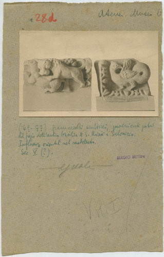 - ISCRIZIONI supporto primario: verso: in alto a sinistra - MUSéE BYZANTIN D'ATHéNES/ 69-77 FRAGMENTS PROVENANT DE LA FRISE D'UNE BASILIQUE/ PALEOCHRETIENNE DE SALONIQUE, (HAUT-RELIEFS DU V S.). - a matita - francese
