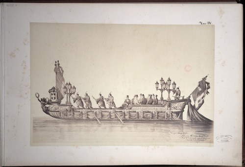 - NOTIZIE STORICO CRITICHE Album: didascalia relativa alla IV tav.: «[c. 3v: titolazione:] Tavola IV./ [titolazione:] Barca pella [sic] rappresentanza governativa che accompagnava il feretro./ Di pur grandi dimensioni apprestai altra barca pella [sic] rappresentanza governativa; allasta di prua una/ fama protese le braccia offre due corone di alloro, uno dei fratelli italiani, laltra amorevole tributo di que generosi/ di Francia, che addolcirono con affettuose cure il dolore del grande esule. Parimenti din sulla prua vi posi un fanale triango=/ =lare con nelle faccie [sic] a tinte diafane, il leone di San Marco, lo stemma di casa Savoja, la bandiera italiana, ad indicare come/ quasi da codesto cuneo e fu rotto il mafso [sic] che ci abbarrava la via alla indipendenza./ [c. 4r:] Daccosto il fanale il glorioso vefsillo [sic] di Venezia del 1848 e lodierno dItalia una./ In questa barca lasciai si scorgefse [sic] il governale con allusione allo scopo a cui la si apprestava, pei rappresentanti di chi ci regge; i bordi della barca sono adorni con drapperie di veluto [sic] nero a trine e ciondoli di argento.»
