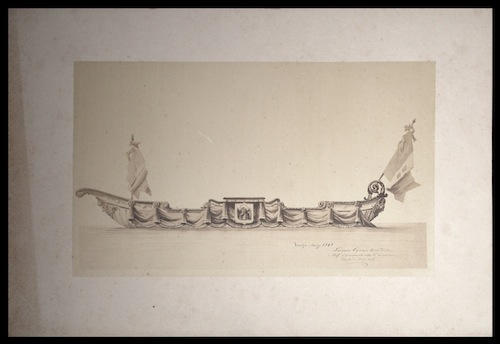 - NOTIZIE STORICO CRITICHE Dal confronto con l'album (vedi campo strutturato FNT) cui appartiene l'esemplare aggregato, la didascalia relativa all'immagine recita: «[c. 4r: titolazione:] Tavola V./ Ventiquattro erano le barche per le rappresentanze provinciali e comunali dItalia pavesate a veluti [sic] neri/ orlati in argento e due candelabri a fiammelle uno in prua ed uno in poppa.»