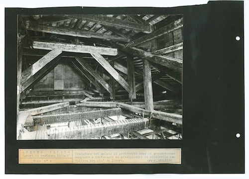 Ateneo Veneto Lavori di restauro 1956-57: foto n° 4: Travature del solaio di sottotetto come si presentavano composte e rinforzate da avvolgimenti di cordicella metallica non più in lavoro.