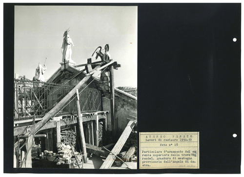 Ateneo Veneto Lavori di restauro 1956-57: foto n° 18: Particolare d'armamento del corrente superiore della trave Vierendel. Armatura di sostegno provvisoria dell'angelo di destra.