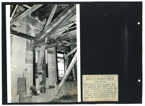 Ateneo Veneto Lavori di restauro 1956-57: foto n° 12: Particolare dell'incastro delle capriate provvisorie sul muro di facciata a San Fantin tendente a sottrarre qualsiasi carico al solaio della sottostante sala delle conferenze (Aula Magna già Oratorio della Scuola).