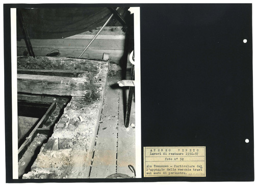 52: Ala Tommaseo - Particolare dellappoggio delle vecchie travi sul muro di perimetro.