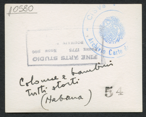 - ISCRIZIONI supporto primario: verso: in basso al centro - Colonne e bambini/ Tutti storti/ (Habana) - a matita -