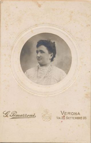 La stampa fotografica è montata su supporto secondario in cartoncino color avorio con macchie di muffa, inscritta in cornicetta circolare in rilievo