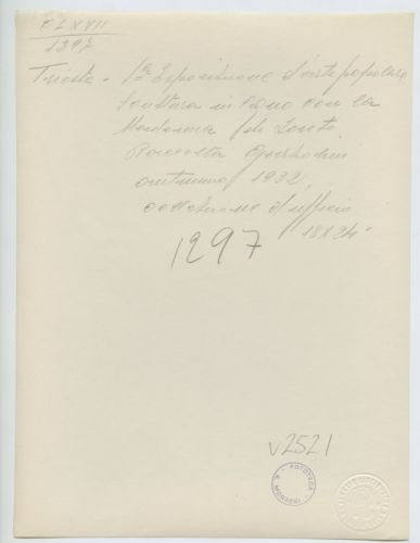 - ISCRIZIONI supporto primario: verso: in alto al centro - Trieste - I Esposizione arte popolare/ Scultura in legno con la/ Madonna di Loreto/ Raccolta Garzolini/ autunno 1922/ collezione d'ufficio/ 18x24 - a matita -