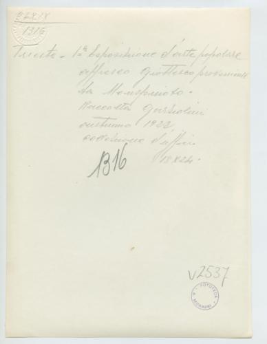 - NOTIZIE STORICO CRITICHE La fotografia fa parte dell'insieme archivistico denominato "Venezia Giulia" (tre cartelle: V. VIII, V. IX, V. X), nello specifico, è conservata all'interno della cartella V. IX. E' stata realizzata nel 1922 da Pietro Opiglia, che dal 1908 al 1947, svolse il ruolo di fotografo presso il Museo Civico triestino e del quale si serviva l'Ufficio Belle Arti della Venezia Giulia durante le proprie campagne fotografiche. In questo caso, l'Ufficio Belle Arti aveva promosso una campagna ricognitiva circa le opere d'arte presenti sul territorio transfrontaliero che oggi comprende il Friuli Venezia Giulia, la Croazia e la Slovenia. Antonio Morassi svolse il ruolo di funzionario sovrintendente presso l'Ufficio Belle Arti della Venezia Giulia dal 1920 al 1925. La fotografia fa parte di una serie realizzata durante la Prima mostra d'arte popolare italiana, che si tenne a Trieste nel 1922.