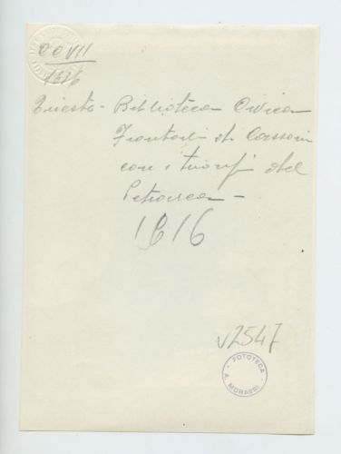 - ISCRIZIONI supporto primario: verso: a sinistra - Trieste - Biblioteca Civica/ Frontali di Cassoni/ con i trionfi del/ Petrarca - a matita -