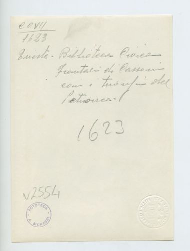 - ISCRIZIONI supporto primario: verso: a sinistra - Trieste - Biblioteca Civica/ Frontali di Cassoni/ con i trionfi del/ Petrarca - a matita -