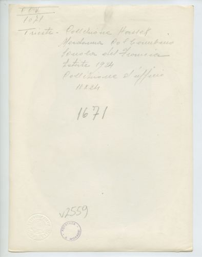 - NOTIZIE STORICO CRITICHE La fotografia fa parte dell'insieme archivistico denominato "Venezia Giulia" (tre cartelle: V. VIII, V. IX, V. X), nello specifico, è conservata all'interno della cartella V. IX. E' stata realizzata nell'estate 1924 da Pietro Opiglia, che dal 1908 al 1947, svolse il ruolo di fotografo presso il Museo Civico triestino e del quale si serviva l'Ufficio Belle Arti della Venezia Giulia durante le proprie campagne fotografiche. In questo caso, l'Ufficio Belle Arti aveva promosso una campagna ricognitiva circa le opere d'arte presenti sul territorio transfrontaliero che oggi comprende il Friuli Venezia Giulia, la Croazia e la Slovenia. Antonio Morassi svolse il ruolo di funzionario sovrintendente presso l'Ufficio Belle Arti della Venezia Giulia dal 1920 al 1925.