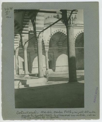 - ISCRIZIONI supporto secondario: recto: in basso a sinistra - Costantinopoli. Atrio della Moschea di Fatih, sul posto dell'antica/ chiesa di SS. Apostoli (1471). Le colonne verdi sono antiche/ e a[lle] loro volta/ forse provengono dai SS. Apostoli - a matita -
