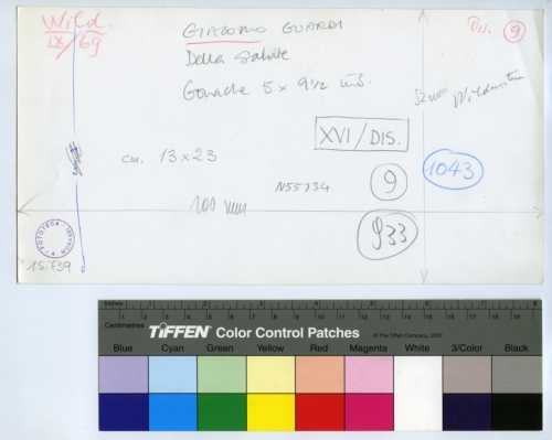 - ISCRIZIONI sul supporto primario: verso - Wild./ IX/69 - Giacomo Guardi/ Della Salute/ Guache 5 x 9 1/2 inc. - cm. 13x23 - Wildenstein - N55734 - 9 - XVI/DIS. - 1043 - 933 - cm. 3 - 100 mm - 52 mm - 15.739 - Fototeca-A. Morassi - Morassi, Antonio e collaboratori. Collaboratori dell'Archivio Fototeca Antonio Morassi -