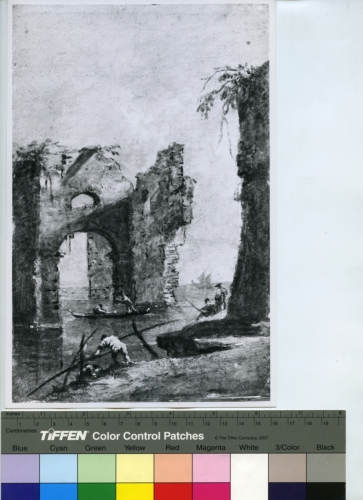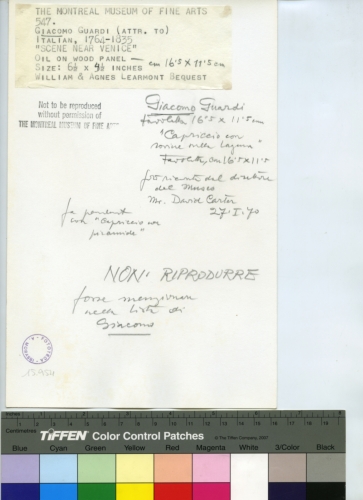 - ISCRIZIONI sul supporto primario: verso - The Montreal Museum of Fine Arts/ 547/ Giacomo Guardi (Attr.to)/ Italian, 1764-1835/ "Scene near Venice"/ 6 1/2x4 1/2 Inches/ oil on wood panel/ Willian & Agnes Learmont Bequest - Not to be reproduced/ without permission of the Montreal Museum of Fine Arts - Giacomo Guardi/ Tavoletta/ 16,5x11,5/ "Capriccio con rovine nella Laguna"/ Tavoletta, 16,5x11,5/ [...] dal direttore/ del museo/ Mr. David Carter/ 27.I.70 - fa "pendant"/ con "Capriccio con piramide" - Non riprodurre/ [...]/ con Giacomo - Fototeca-A. Morassi - 15.954 - Mittente. Morassi, Antonio e collaboratori. Collaboratori dell'Archivio Fototeca Antonio Morassi -