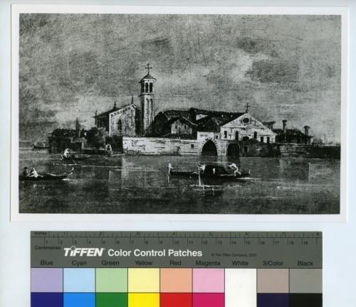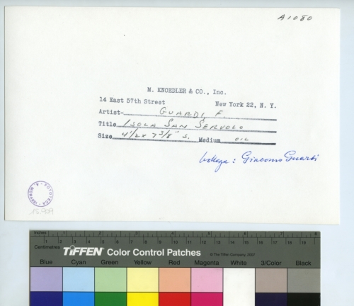 - ISCRIZIONI sul supporto primario: verso - A1080 - M. Knoedler & CO. Inc./ 14 East 57th Street New York 22, N.Y./ Artisti Guardi F./ Title Isola di San Servolo/ Size 4 1/2 x 7 3/8 '' s Medium Oil - Bottega: Giacomo Guardi - Fototeca-A. Morassi - 15.909 - Mittente. Morassi, Antonio. Collaboratori dell'Archivio Fototeca Antonio Morassi -